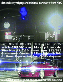 danceable synthpop and minimal darkwave from NYC RARE DM https://rare-dm.bandcamp.com/ https://soundcloud.com/rare_dm with special guests 2020K (queer pop and electronics) https://2020k.bandcamp.com/ Rowan Sullivan (dark wave and IDM from Georgia, now at CMU!) https://www.instagram.com/rowanxghost/